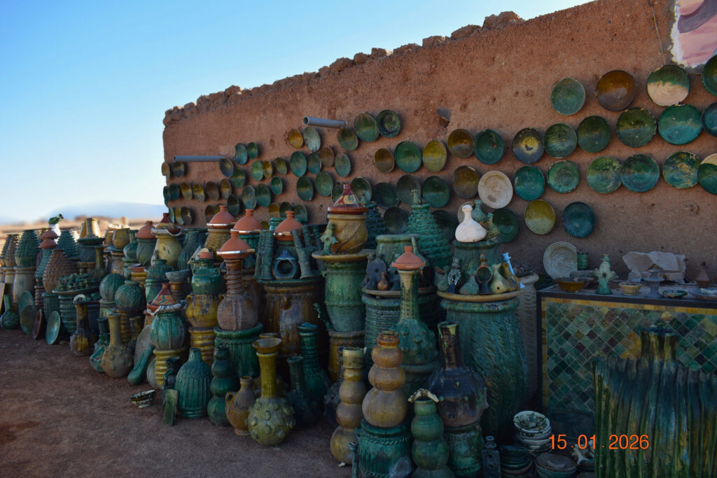 Zaczynamy dzień od wizyty w Tamegroute, znanym z pięknej zielonej ceramiki. Następnie kierujemy się w stronę Agadiru, podziwiając majestatyczną dolinę Draa. Nocleg w Akdaz wśród gajów palmowych to idealne zakończenie dnia! 🌴
