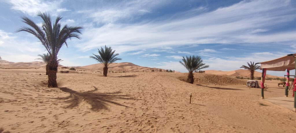 Rano ruszamy na pustynię! 🌵 Po przywitaniu w obozie, delektujecie się orzeszkami i herbatą, a następnie czas na berberyjską pizzę na wydmach Erg Chebbi. Kulminacją dnia będzie przejażdżka na wielbłądach podczas zachodu słońca – magiczny moment, który zapamiętacie na zawsze! Wieczór w tradycyjnym namiocie berberyjskim, spędzicie tam czas przy ognisku, delektując się atmosferą pustyni. 🔥🌅